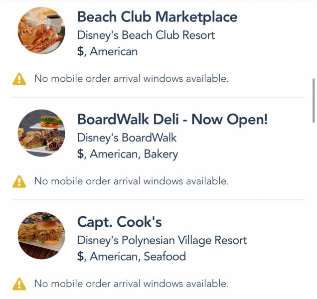 Other restaurants were showing that there were no Mobile Order arrival windows available. This included restaurants at Disney’s Beach Club Resort, Disney’s BoardWalk, Disney’s Polynesian Village Resort, and more.
