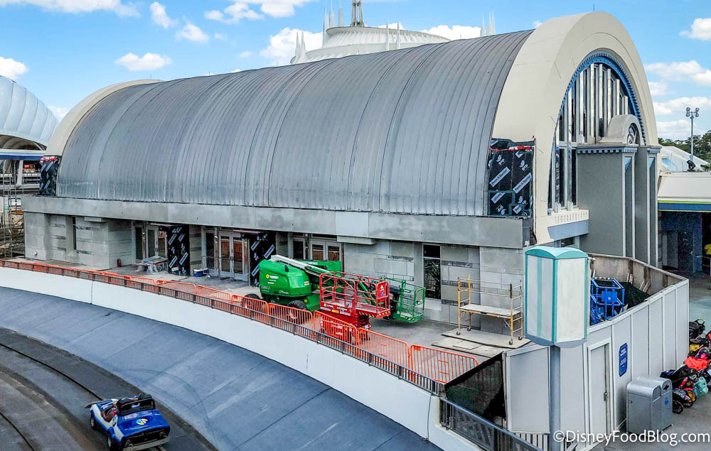 We checked in on Tomorrowland Light & Power Co. on a recent PeopleMover ride and saw that there’s still some exterior work being done on the Tomorrowland Speedway side of things.