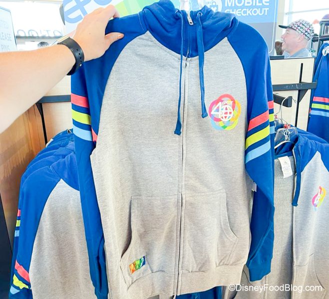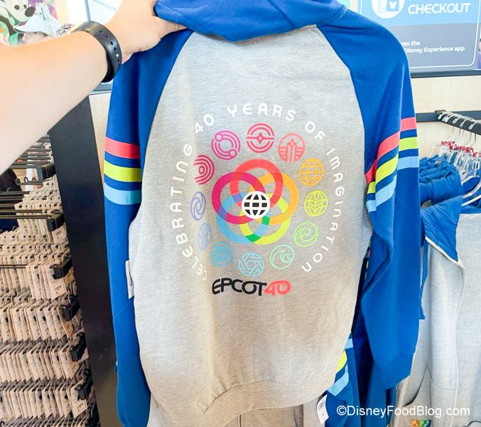 You want some fun 40th anniversary clothes? We’ve got TONS, including a Zip-Up Hoodie for $52.99 with the EPCOT 40 logo on the front…