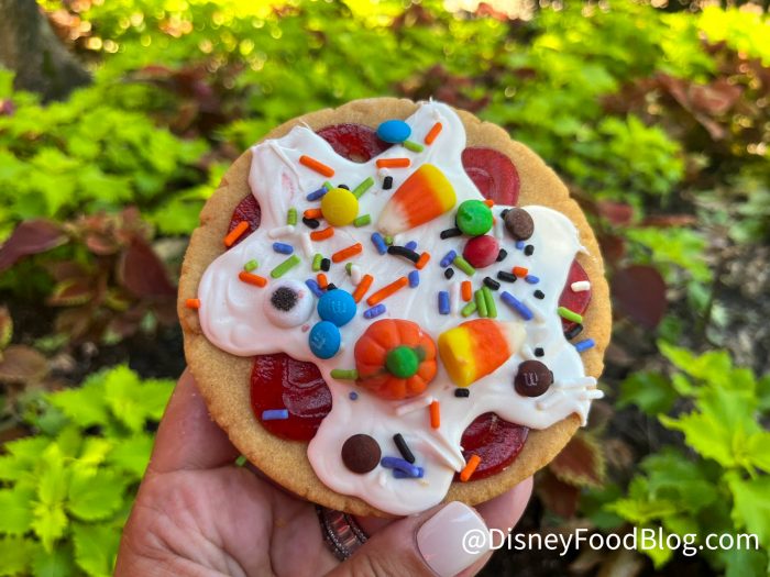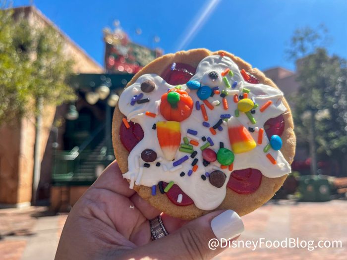 Okay, so if you’ve read us for a while, you know we’re not THRILLED about eating at PizzeRizzo at Disney’s Hollywood Studios — and it has nothing to do with the owner being a rat! The food here has surprised us occasionally, so let’s see how we feel about the Halloween Candy Cookie Pizza.