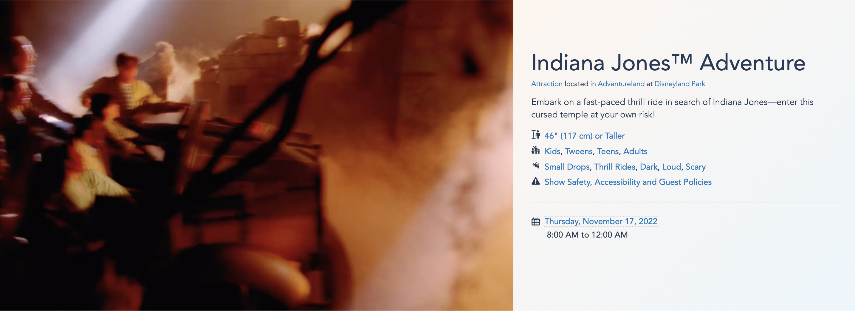 And, when you view November 14th on the Disneyland calendar, it lists Indiana Jones Adventure as being closed for refurbishment.Â