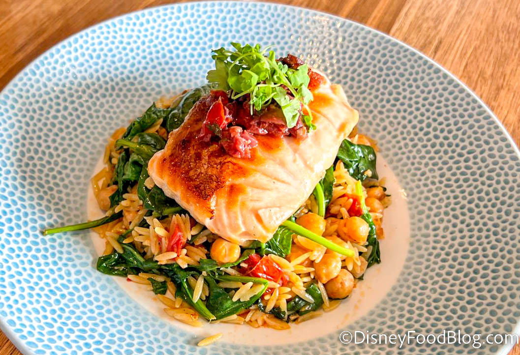 Next up is the Salmon with Orzo. It has seared salmon with Pomodroccio tapenade and lemon orzo. And like the salad, it’s earning all the presentation points! Order it for $20.99.