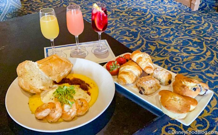 Before your meal, you can briefly meet with Cinderella and you may also spot her appearing in the restaurant for a second. Breakfast starts with breakfast pastries, and then adults can choose one entree with options such as quiche, avocado toast, shrimp and grits, and more. Adults can also opt to order mimosas at an extra cost, including a mimosa flight!
