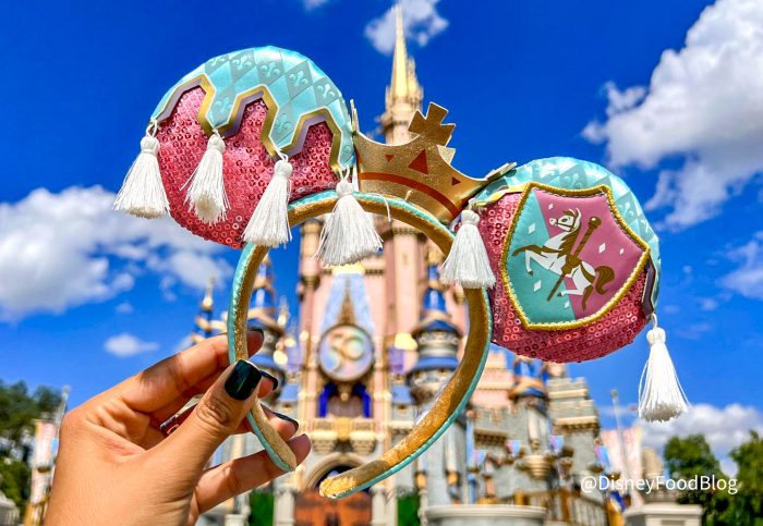 These pink, blue, and golden ears are every royal’s dream! The ears feature a golden crown in place of the traditional bow. There are also white tassels hanging from both ears.