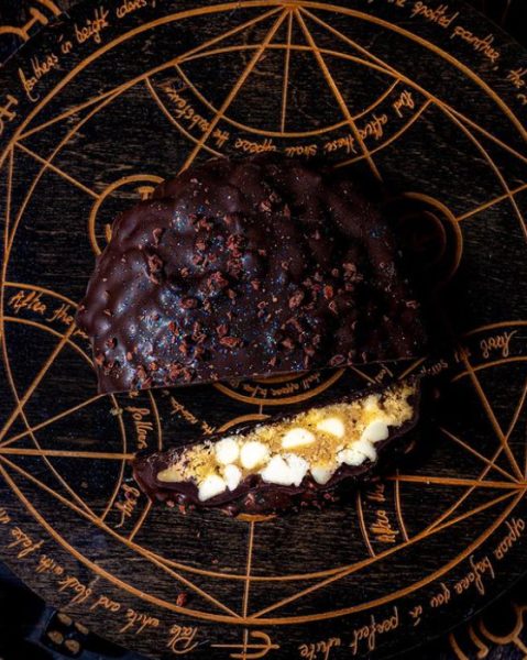 So here’s the deal — the Black Cat Cookie is only available for ONE DAY each year and you can only get it at Gideon’s Orlando East End location. It’s a White Chocolate Chip Cookie completely covered in premium Dark Chocolate with Black Glitter and Cacao Nibs.