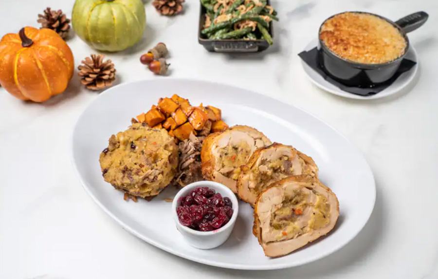 - Carved Turkey Breast with cornbread, apple-sage stuffing, turkey thigh confit, mashed potato, fall harvest vegetables, cranberry compote, and turkey gravy (New)