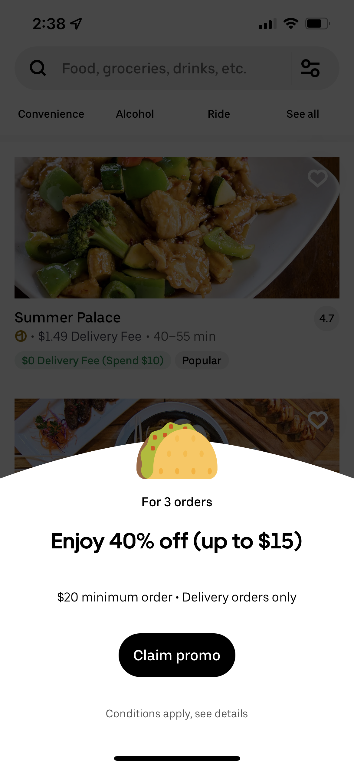 When you open the UberEats app, there is usually some sort of pop-up deal that you can use for your order! Don’t just skip over them — see if they apply to your order and use them to save some money! For example, when we opened the app, we got a pop-up that said “Enjoy 40% off (up to $15).”