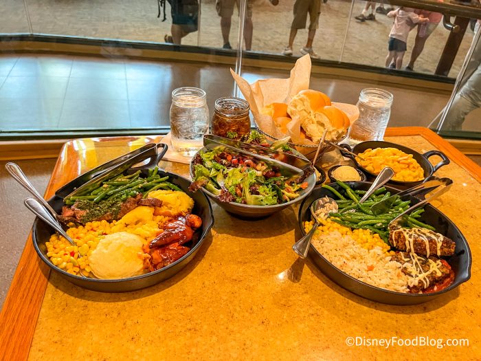 Offering Chip ‘n Dale’s Harvest Feast as an all-you-can-eat lunch or dinner, this spot serves up some stellar platters of classic flavors like Backyard Grilled Steak, Rotisserie-roasted Turkey, mac & cheese, and mashed potatoes (and some seriously fresh salad made with produce grown right in The Land pavilion). All this is brought to your table while you ACTUALLY ROTATE through scenes from the Living with the Land attraction below. Add that Mickey, Pluto, and Chip ‘n Dale visit your table and this is a pretty fun spot. Lunch and Dinner meals are $62 for adults and $42 for kids.
