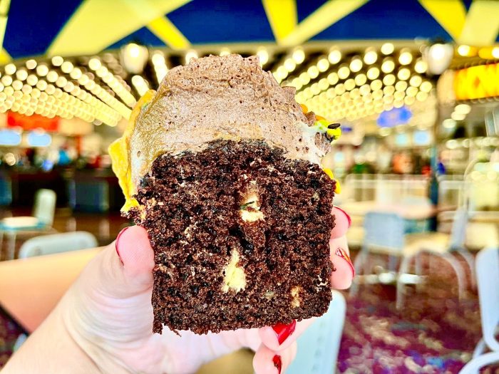 The frosting on this cupcake did melt in our mouth — it’s very light, and the cake is moist. Flavor-wise, we found it to be rich and sweet, but just a basic chocolate flavor. And, we found ourselves wanting MORE flavor, in general — even just the basic chocolate.
