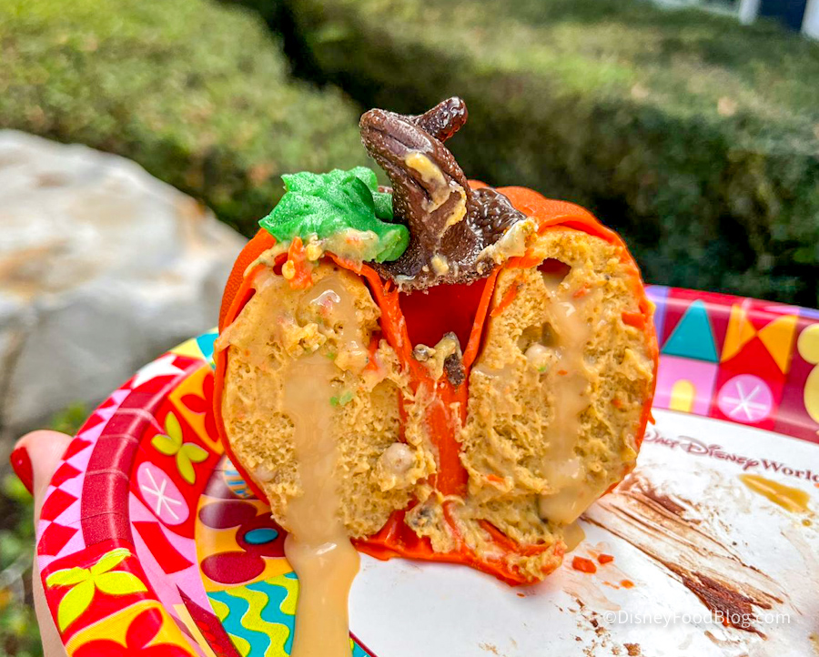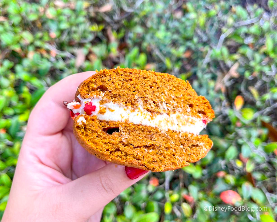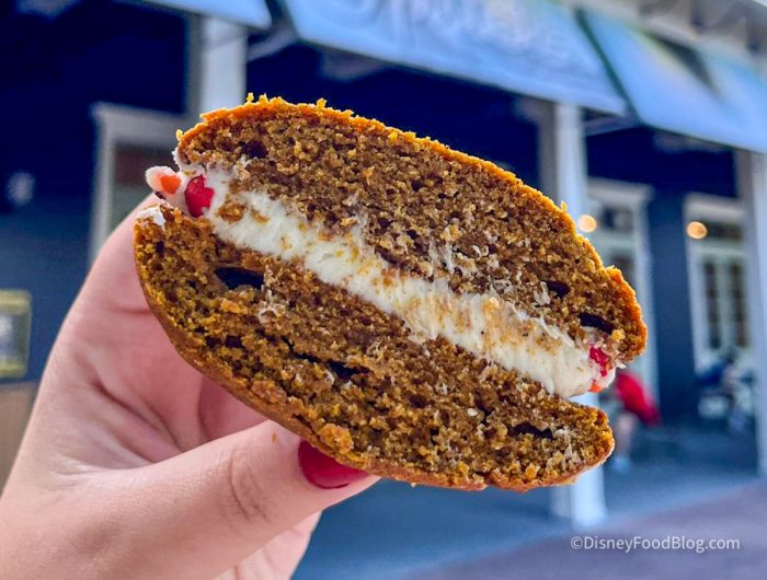 Whoopie Pies are something that tend to pop up more around the parks close to the holidays and can either be a big hit or a bit of a miss. So, we were excited to give this one a try. The Fall Whoopie Pie is made with pumpkin cake, cream cheese buttercream, and fall sprinkles. The ingredients are simple, but as you may have learned from reading DFB, sometimes simple is best with these treats!
