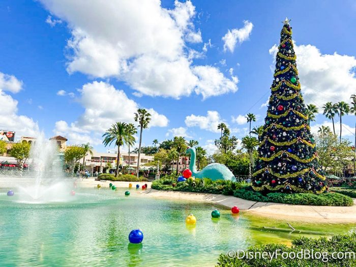 Today, that tree has arrived! You’ll find it in the Echo Lake area of the park, surrounded by floating giant ornaments and near Gertie the dinosaur in her Santa hat.