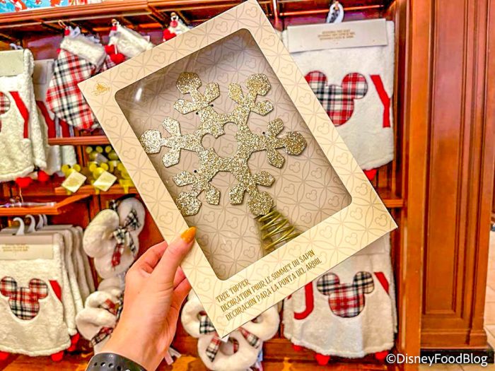 Another gift for your Christmas tree is this Mickey snowflake tree topper. It’s a sparkly gold snowflake with a Mickey shape in the middle.