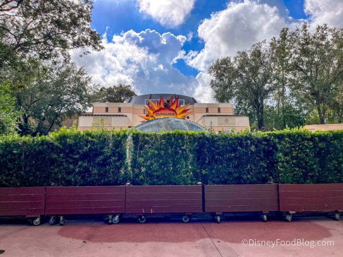 The construction bushes are still out in front of the fountain at the entrance of Dinosaur in Animal Kingdom. The fountain was refurbished earlier this year, so we’re not quite sure what’s going on here!