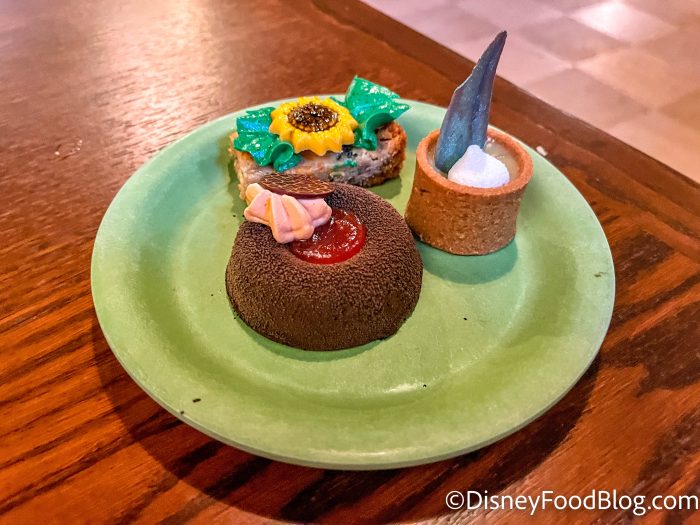 Finally, let’s talk about dessert! There’s a Fab Five Safari Brownie — it has Mickey and friends on top.