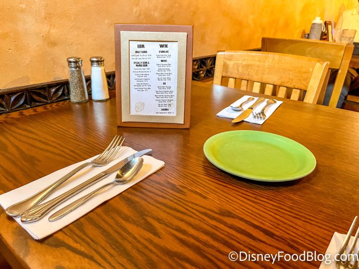 Once you get your text, you’ll walk past the host’s stand and down a side pathway. There we were greeted by a set of Cast Members who were in charge of seating guests inside the restaurant. We had to wait a minute at the door, but then we were led to our table!