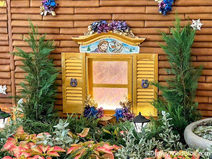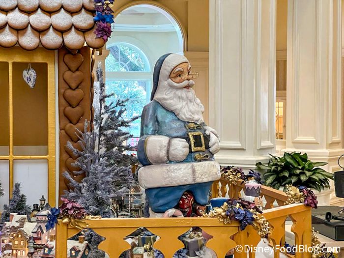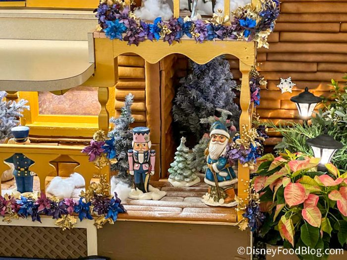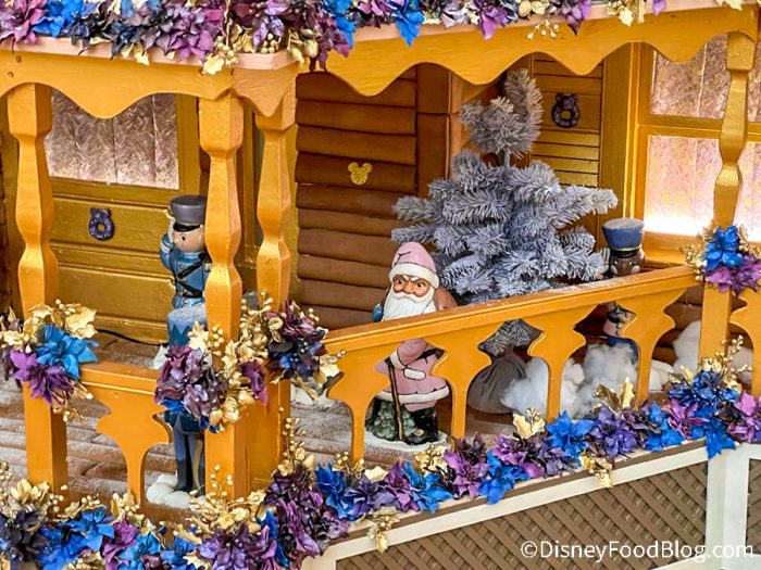 Let’s tour around this gingerbread masterpiece, and we’ll point out some of our favorite details! The EARidescent colors of Disney World’s 50th Celebration made their way into the design, with blue and gold accents everywhere, including a lot of blue plants around the house.