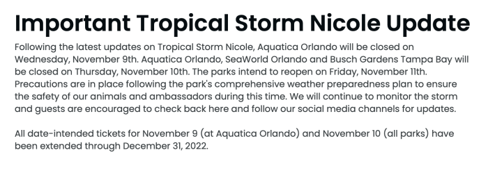 SeaWorld Orlando is shutting down due to Tropical Storm Nicole. Aquatica Orlando is closed today, November 9th, and will remain closed tomorrow, November 10th. Also closing tomorrow is SeaWorld Orlando and Busch Gardens Tampa Bay.