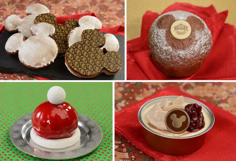 - Vanilla, Cherry, and Gingerbread Cheesecake: Vanilla cheesecake with chocolate cheesecake swirl, Morello cherries, whipped gingerbread panna cotta, and milk chocolate Mickey coin (New)