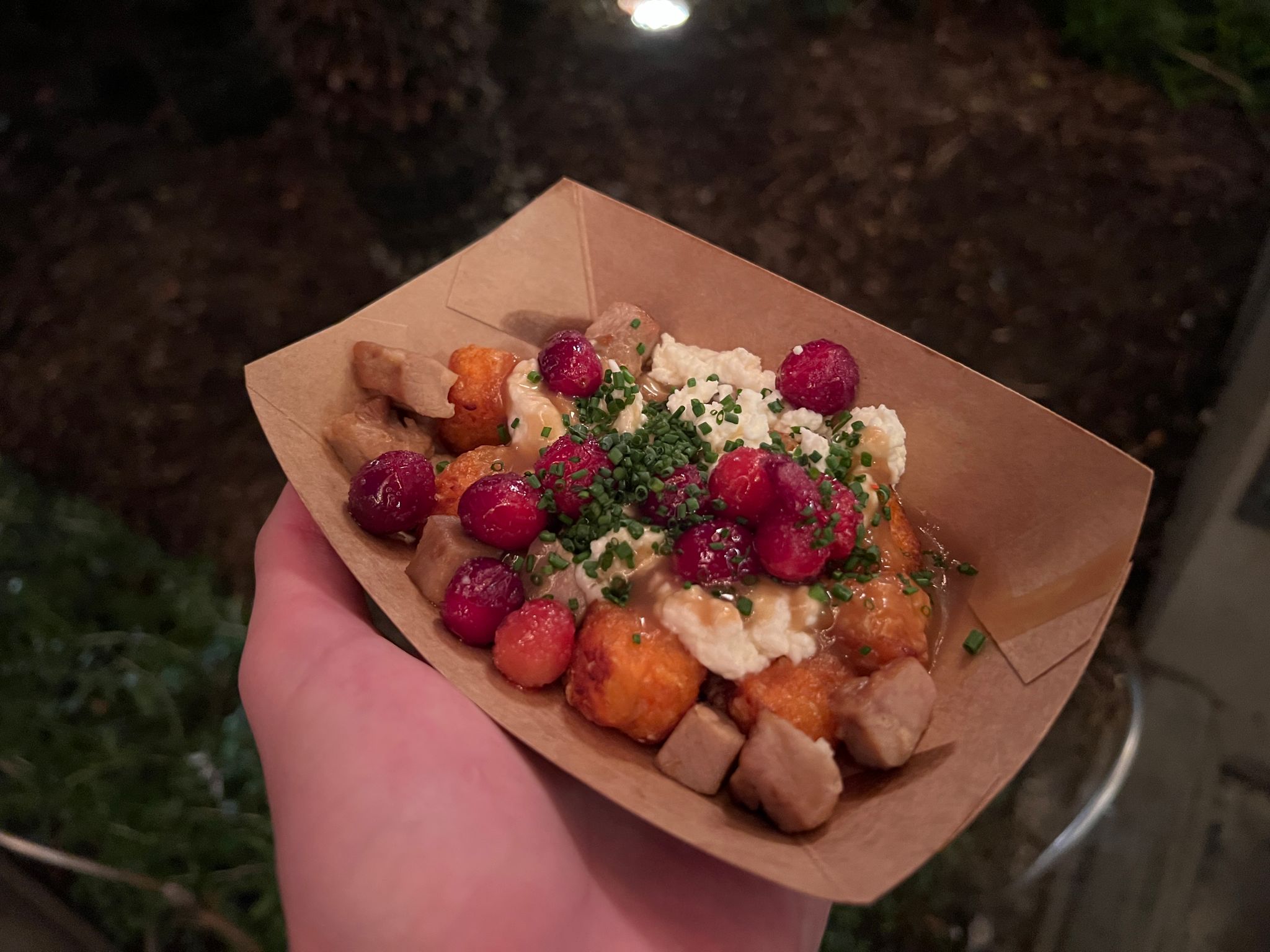 We thought the cheese curds were a little soft and mushy instead of being firm and squeaky, and the turkey wasn’t great in terms of flavor or consistency. We did enjoy the sweet potato puffs (basically tots) and frosted cranberries, though!