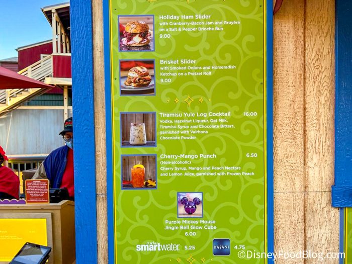 For the 21+ crowd out there, you can get the Tiramisu Yule Log Cocktail, which has vodka, hazelnut liqueur, oat milk, tiramisu syrup, and chocolate bitters, garnished with Valrhona chocolate powder. It costs $16. (You can add the Purple Mickey Jingle Bell Glow Cube to either drink for an additional $6.)