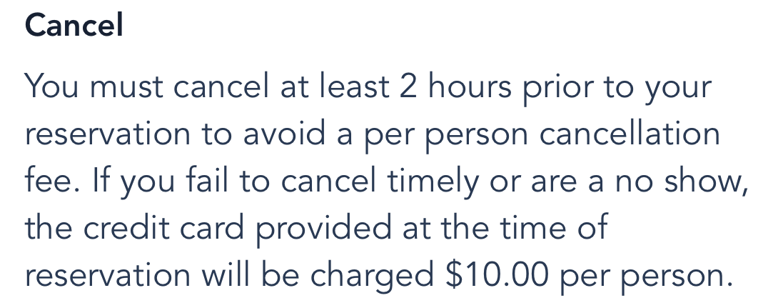 Remember that if you don’t cancel in time and don’t show up to your reservation, you will be charged a $10 per person cancelation fee.