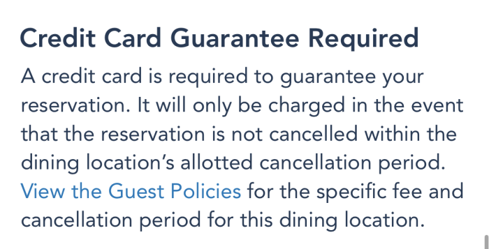 Now, it seems the same change has been made at Disneyland. We went into the Disneyland app this morning to try and make a dining reservation. As we were reviewing the reservation, we went to the Credit Card Guarantee Required section and tapped “View the Guest Policies.”