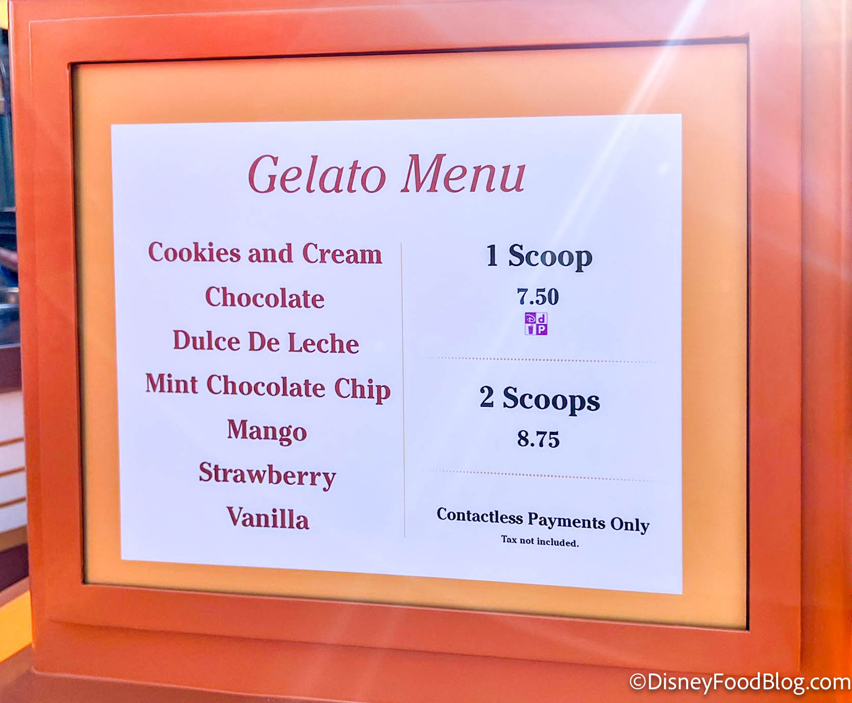 We were VERY excited to find this new snack spot in the park and we of course had to taste a few of the gelato flavors to see what they were like. During our trip, a few different flavors were available including chocolate, dulce de leche, vanilla, and strawberry.