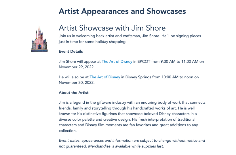Jim Shore will be in EPCOT’s The Art of Disney store on November 29th from 9:30-11AM, and at The Art of Disney in Disney Springs from 10AM-12PM on November 30th! He’ll be greeting guests and signing his artwork for purchase.