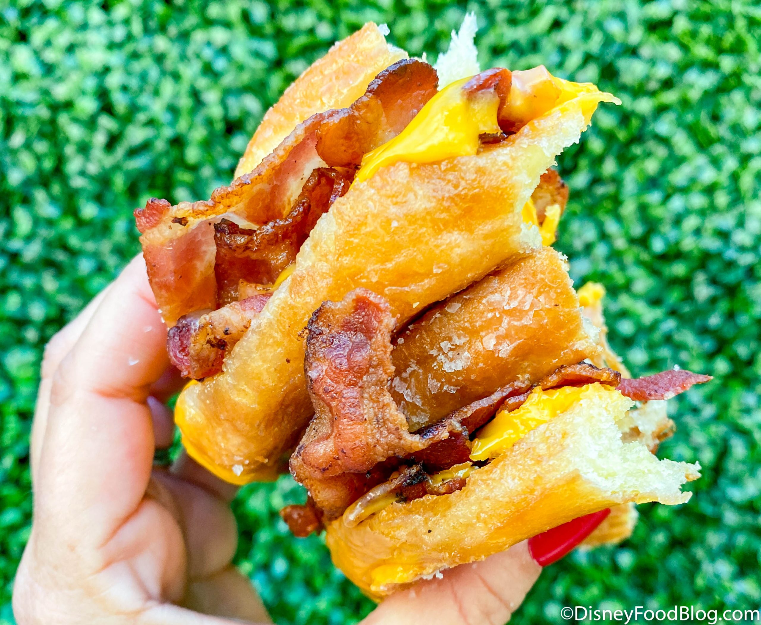 If you’re into sweet and savory combos, this next one is for you. Over at Everglazed Donuts & Cold Brew in Disney Springs, you can order a grilled cheese sandwich. But, for $1 more — you can get it on DONUT BUNS. Yes, you read that correctly. Donut buns.