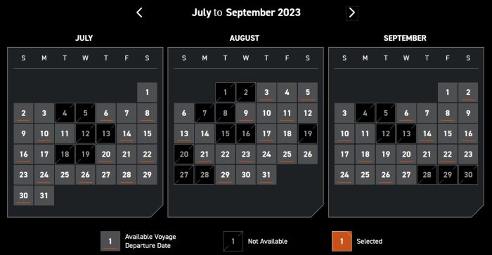 Because a stay (or “voyage”) is a 2-night experience, not every day on the calendar is available as a “start” day. Every 2 days a new boarding group comes in when the old one leaves, so on the calendar the beginning dates of each voyage are marked with an orange line.