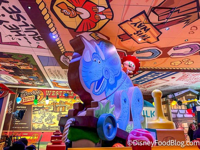 As we mentioned, Roundup Rodeo BBQ will take guests on a rootin’ tootin’ dining experience in a new play area that Andy created for those hungry rodeo cowboys and cowgirls surrounded by western toys and other items (cardboard cutouts, stickers, lights, blocks, and more).