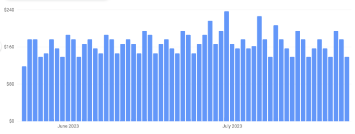 Flights in the summer were pretty consistent, around $150-$160, with several peaks reaching up to $240. The days with the lowest prices were all Wednesdays and Saturdays, and the higher prices were generally on Thursdays. The highest peak was over the Fourth of July weekend.