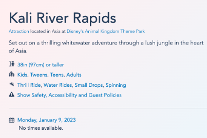 Kali River Rapids will close for refurbishment on January 9th, 2023. No times are listed as available on the Disney World website.