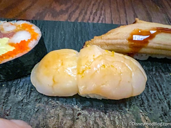 Then we had the scallop sushi, which was surprising! The scallop had an almost citrusy flavor to it that balanced out the wasabi very well.