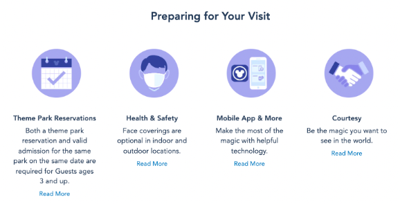 You’ll find several important updates on the Disney World website, including the latest health and safety information, theme park reservations, help with the mobile app, and more. Disney recently added a new section on the Preparing for Your Visit page labeled “Courtesy” with a message that reads, “Be the magic you want to see in the world.”