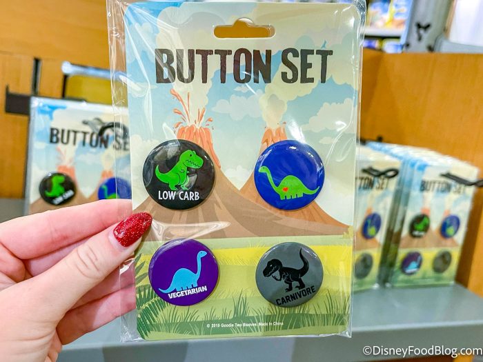 And finally, we spotted an adorable Dinosaur Button Set at Dino Institute. Looks like the T-Rex is reppin’ that low-carb diet, while vegetarians can grab a separate pin in the set to show off their love of leafy greens.