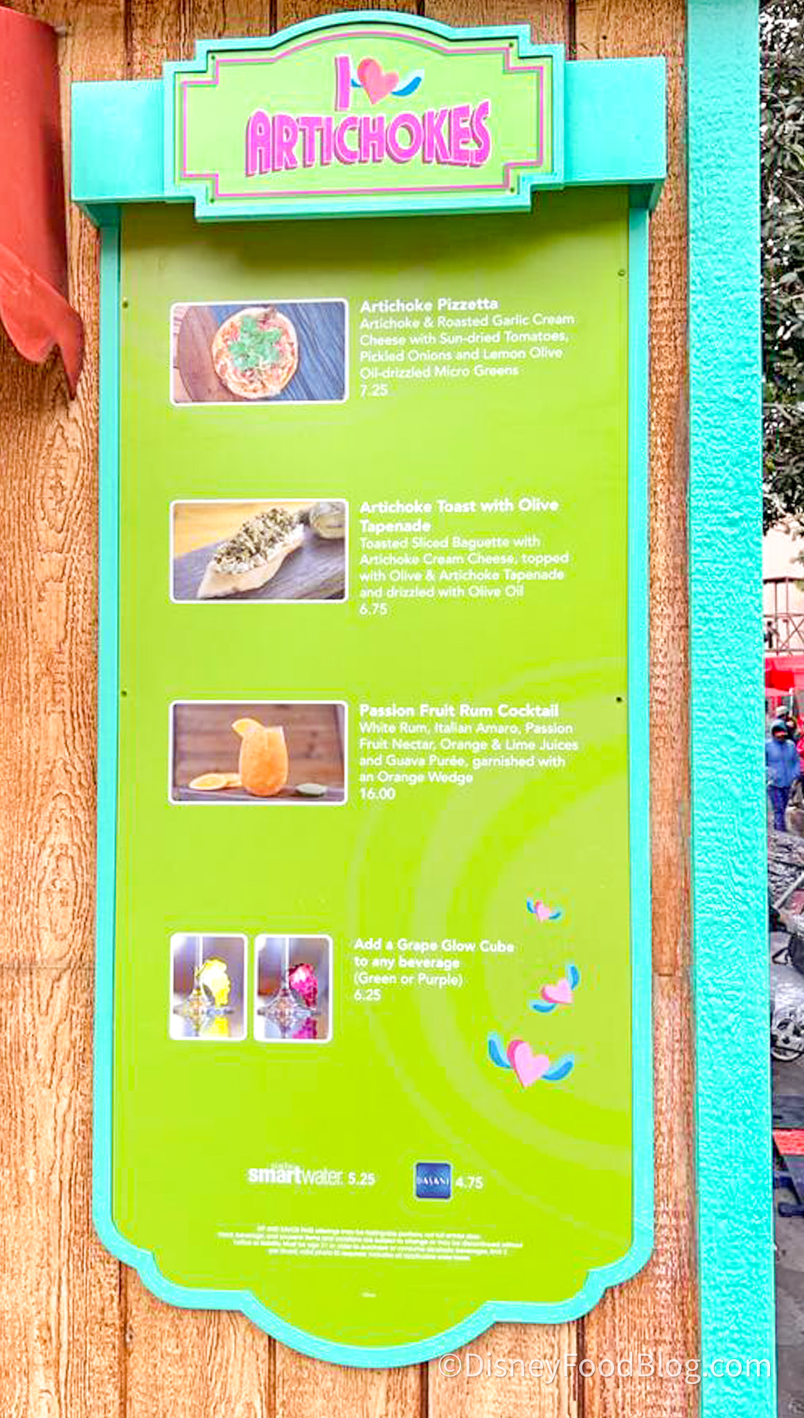 - Artichoke Toast with Olive Tapenade: Toasted sliced baguette with artichoke cream cheese, topped with olive & artichoke tapenade and drizzled with olive oil – $7.25