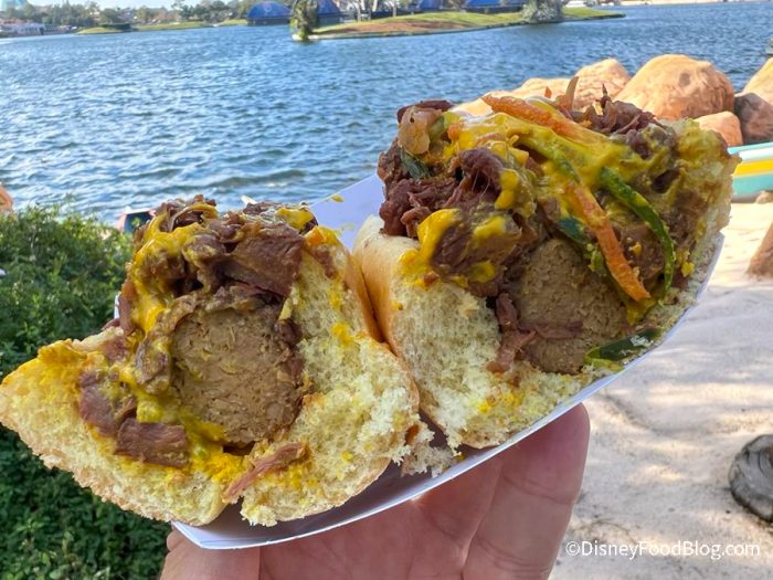 - Plant-based Bratwurst with spicy turmeric aïoli, coffee barbecue jackfruit, and slaw (Plant-based item) – $9.50