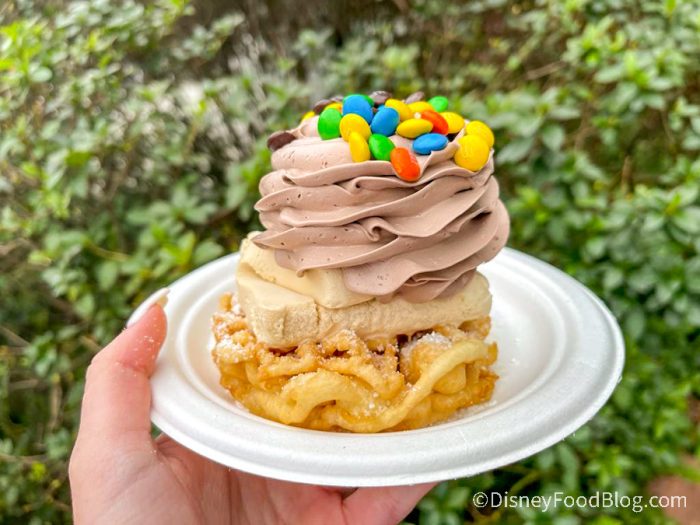 - Mocha Funnel Cake: Mini Funnel Cake with cappuccino ice cream topped with chocolate whipped cream and M&M’S chocolate candies (New) — $9.50