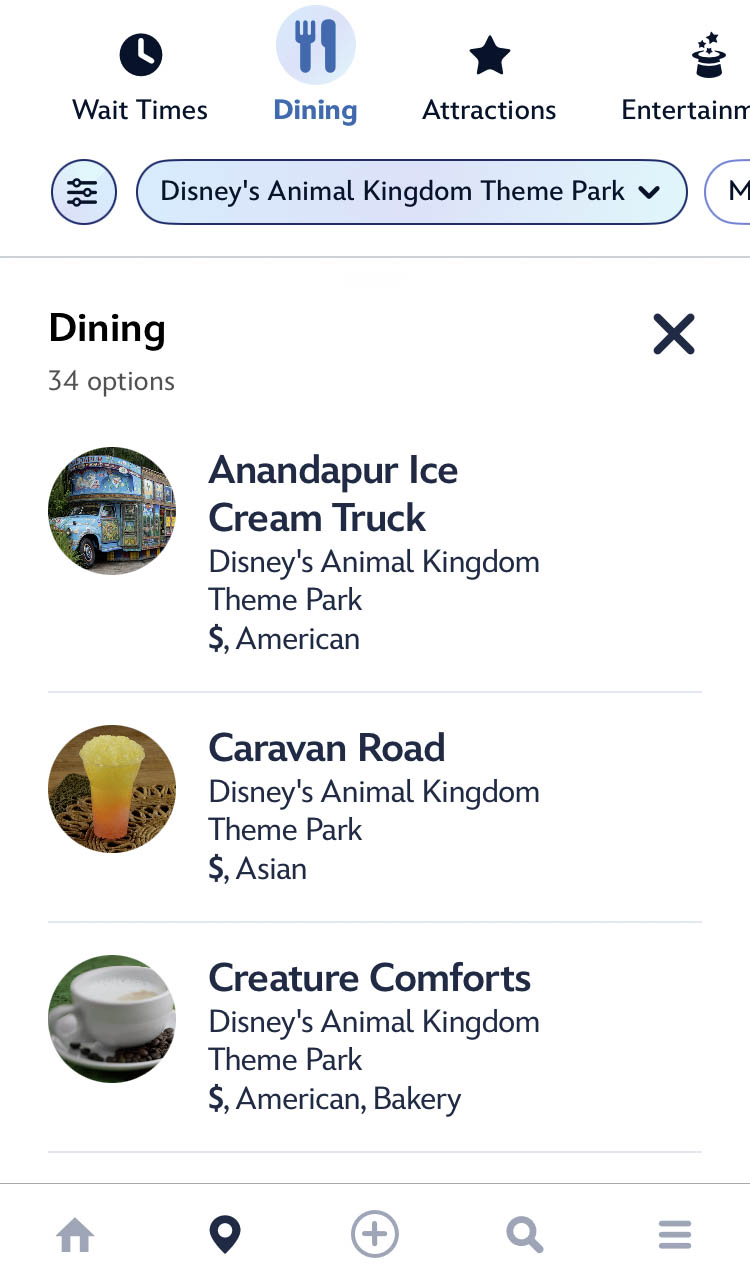 To find the allergy options at each restaurant in the app, you’ll want to go to the map section (it’s the second icon from the left at the bottom of the screen), then click on the arrow next to “Wait Times” at the top of the screen. From there, you can select “Dining” to see all the dining options on the map. At the top left of the screen, you can filter by location, and you can also switch between a list view and a map view.