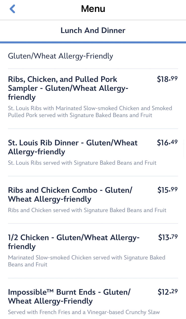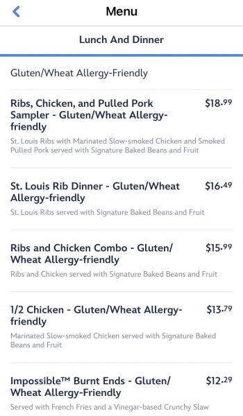 Now that you know how to view the menus ahead of time, let’s talk about the restaurants with the best options! Flame Tree Barbecue has a St. Louis Rib Dinner, a Ribs and Chicken Combo, a 1/2 Chicken, and a Smoked Pulled Pork Sandwich and MORE that are all gluten-free if you’ve got a hankering for barbecue.