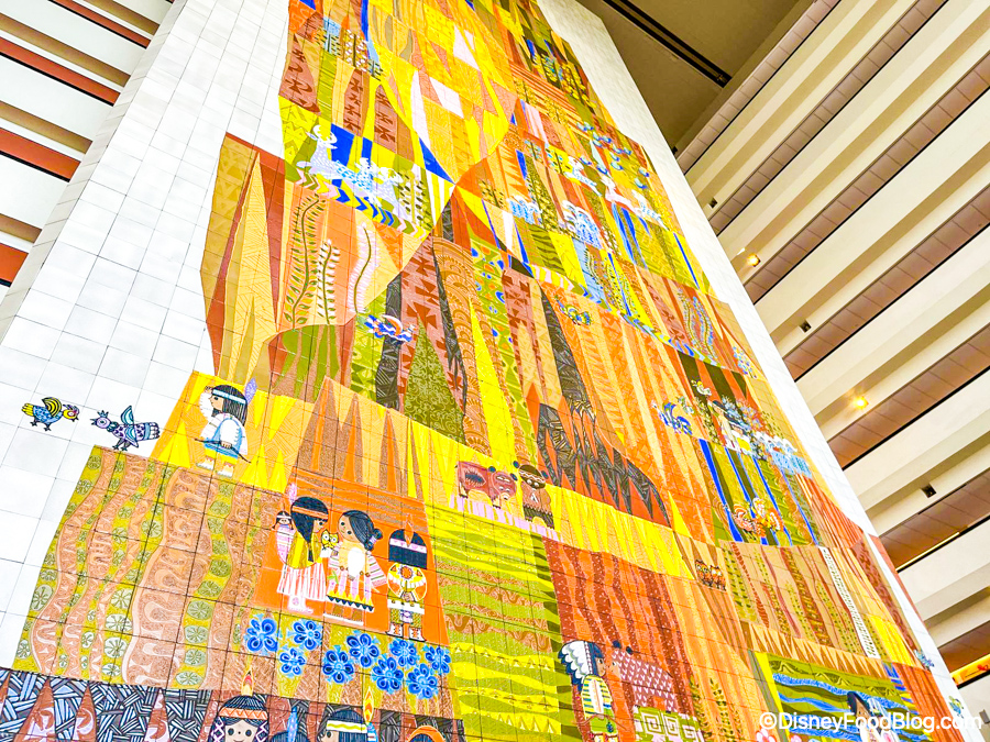 There’s also a massive mural on the wall created by Mary Blair, a famous Disney artist. This is a super fun touch for Disney history fans. Remember that art museum vibe we mentioned earlier… um, yeah.