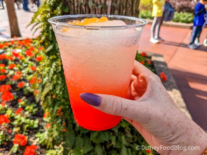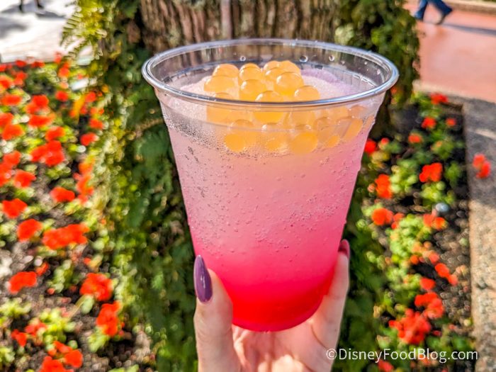 Annual Passholders can enjoy an extra special treat: at any Joffrey’s location in EPCOT, you can order their Frozen Little Spark. This has the same frozen base as the others, but it’s a cocktail with black raspberry syrup, mango popping boba pearls, and a splash of Grey Goose.