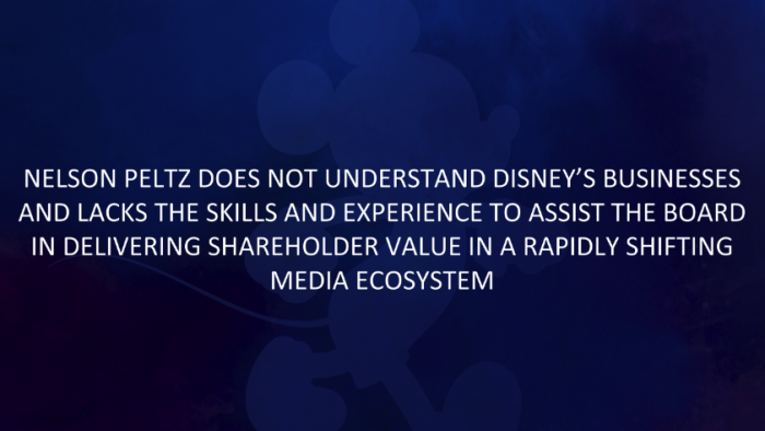 Disney then makes it abundantly clear that they do NOT want Nelson Peltz to be on the Board by saying that Peltz “does not understand Disney’s business and lacks the skills and expertise to assist the Board in delivering shareholder value in a rapidly shifting media ecosystem.” Really, it couldn’t be any more clear.