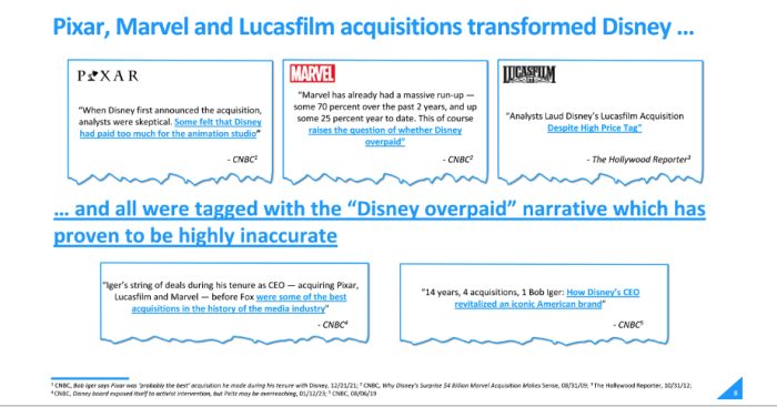 …and making key acquisitions (like of Pixar, Marvel, and Lucasfilm) that “transformed Disney.”