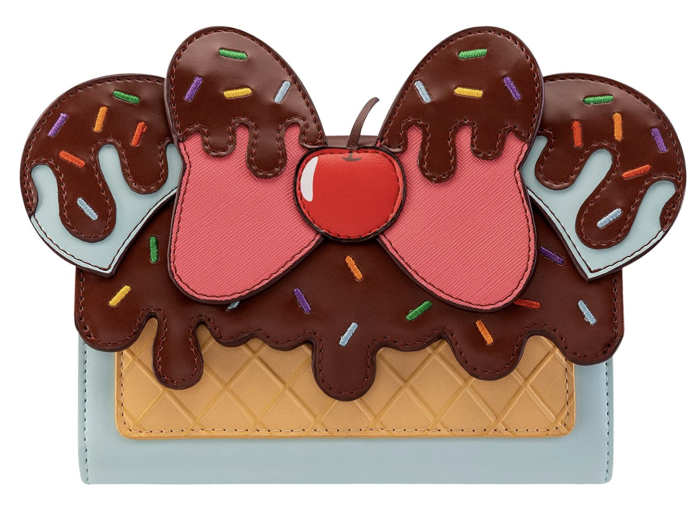 The Minnie Mouse Sweet Treats Fold Snap Wallet is another option to add to your collection, especially if you purchase the matching mini backpack. This wallet features Minnie’s ears and bow, complete with chocolate sauce, sprinkles, and a cherry on top! Like the matching backpack, this wallet is made of vegan leather and features silver hardware.