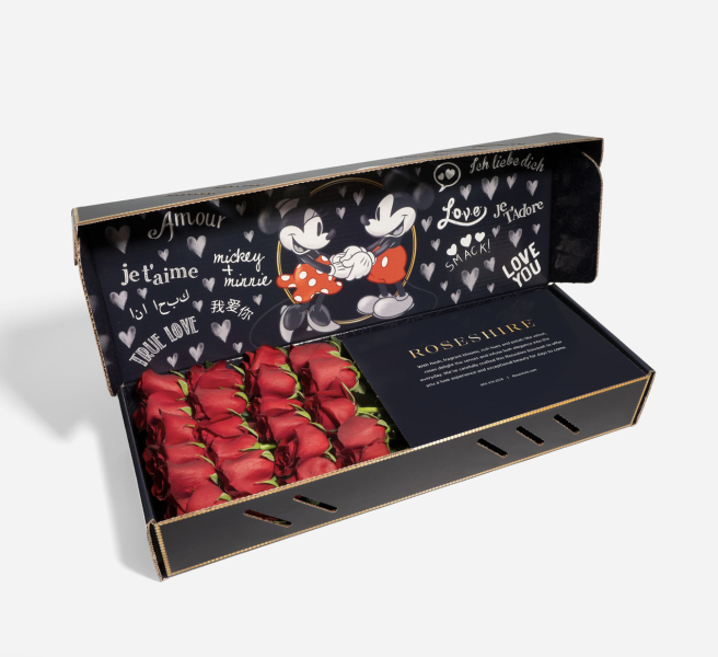 The Love at First Sight Roses are sure to make your sweetheart swoon. Available for $219, these dozen (or two dozen!) roses come in a black box with gold trim, donning images of Mickey and Minnie and inscribed with sweet nothings.