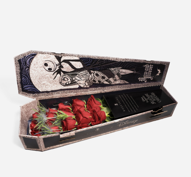 These 20 red roses are laid to rest in a black coffin-shaped box featuring Jack and Sally and are available online for $229.