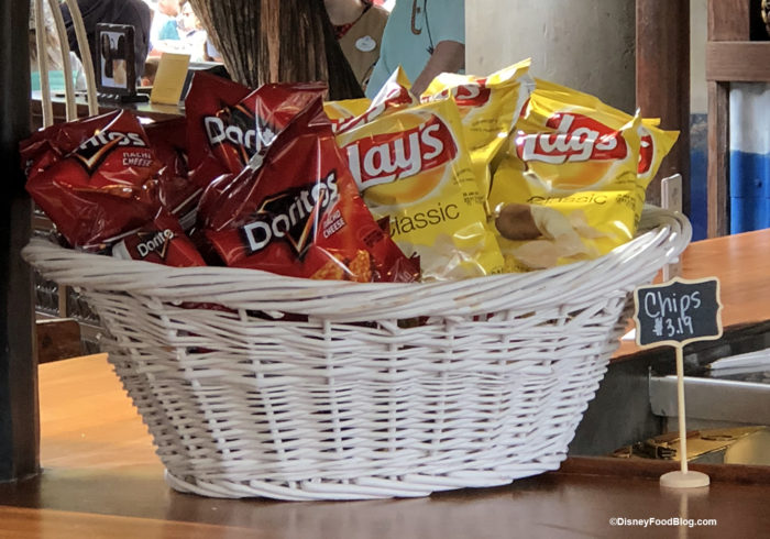 Yep, we’re going there…. the TURKEY LEG. Okay, okay, so maybe this hunk o’ meat isn’t all bad. In fact, the Turkey Leg has some DIE HARD fans. So, despite the fact that this snack is NOT our team’s favorite and tends to be voted off the island by our readers. You can snag jumbo Turkey Legs at a number of spots around Disney World. This time, we swung by Prince Eric’s Village Market in Magic Kingdom to pick up our $15.49 snack. And if the salty meat stick isn’t enough sodium for you, it also comes with a bag of chips (so make sure you get plenty of water to wash it all down)!