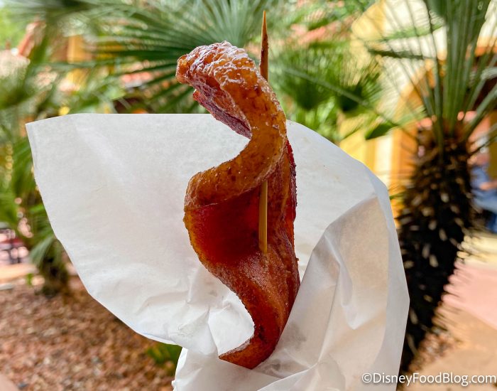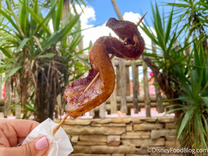 The Candied Bacon Skewer at Westward Ho in Frontierland is a huge, thick piece of bacon. It’s served with potato chips, which makes this snack seem more like a small meal. Even though the flavor of the bacon is outstanding, with the candied coating giving the whole thing sweet-and-savory vibes, the texture might not be for everyone.